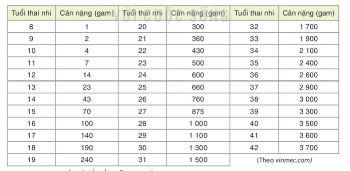Bảng sau cho biết cân nặng thai nhi chuẩn theo tuần tuổi: