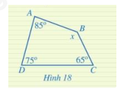 \(\begin{array}{l} \widehat A + \widehat B + \widehat C + \widehat D = {360^0}\\{85^0} + x + {65^0} + {75^0} = {360^0}\\x = {360^0} - {85^0} - {65^0} - {75^0} = {135^0}\end{array}\)