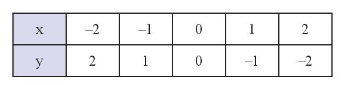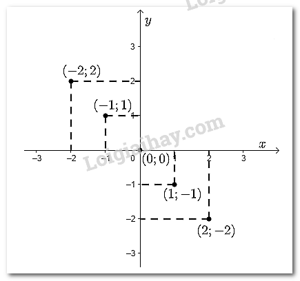 Đồ thị hàm số là tập hợp các điểm có tọa độ \(\left( { - 2;2} \right);\left( { - 1;1} \right);\left( {0;0} \right);\left( {1; - 1} \right);\left( {2; - 2} \right)\) được vẽ trên mặt phẳng tọa độ như hình dưới đây: