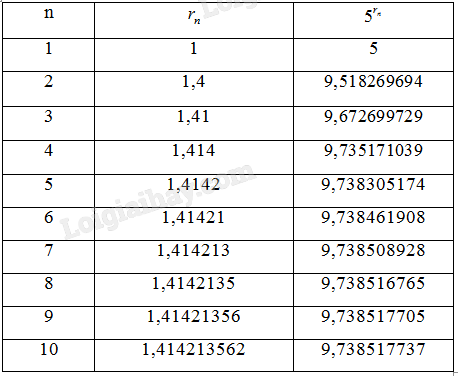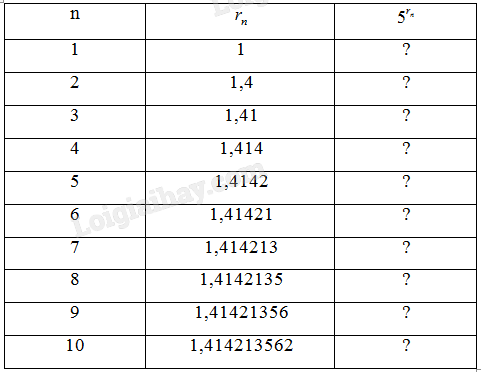 a) Sử dụng máy tính cầm tay, hãy tìm các số \({5^{{r_n}}}\) tương ứng (với 9 chữ số thập phân) cho mỗi dấu "?" trong bảng bên phải. Người ta chứng minh được rằng khi \(n \to + \infty \) thì dãy số (\({5^{{r_n}}}\)) dần đến một giới hạn mà ta kí hiệu là \({5^{\sqrt 2 }}\).