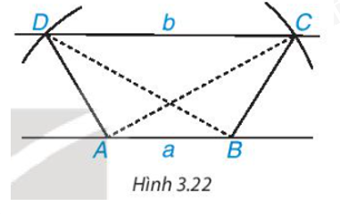 - Vẽ hai cung tròn tâm A và B có cùng bán kính sao cho cung tròn tâm A cắt b tại C; cung tròn tâm B cắt b tại D và hai đoạn thẳng AC, BD cắt nhau. Hình thang ABCD có hai đường chéo AC và BD bằng nhau.