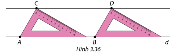 Trong Hình 3.36, Nam di chuyển thước ê ke dọc theo đường thẳng d sao cho cạnh huyền của thước luôn nằm trên d. Khi đỉnh góc \(60^\circ \) lần lượt ở vị trí điểm \(C\) và \(D.\) Nối hai điểm \(C\) và \(D,\) Nam được một đường thẳng song song với d. Em hãy giải thích vì sao?