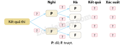 Nghi và Hà độc lập với nhau tham gia thi lí thuyết bằng lái xe hạng A1. Xác suất đề Nghi đỗ kì thi là 0,8 và xác suất để Hà đỗ kì thi là 0,9. Sơ đồ hình cây chưa hoàn thiện bên dưới mô tả các khả năng xảy ra và xác suất tương ứng khi hai bạn tham gia kì thi.