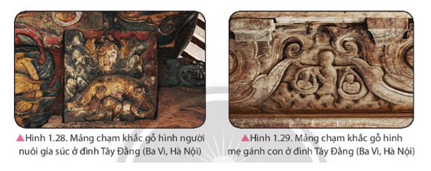 + Các mảng chạm khắc gỗ hình người nuôi gia súc, hình mẹ gánh con tại đình Tây Đằng (Ba Vì, Hà Nội).