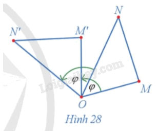 Trong Hình 28, cho các điểm M', N' lần lượt là ảnh của các điểm M, N qua phép quay tâm O với góc quay φ.