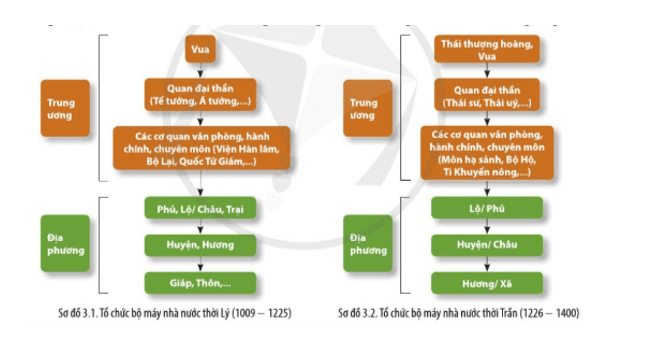 Đọc thông tin tư liệu và quan sát các sơ đồ 3.1, 3.2 hãy nêu đặc điểm mô hình nhà nước thời Lý - Trần.