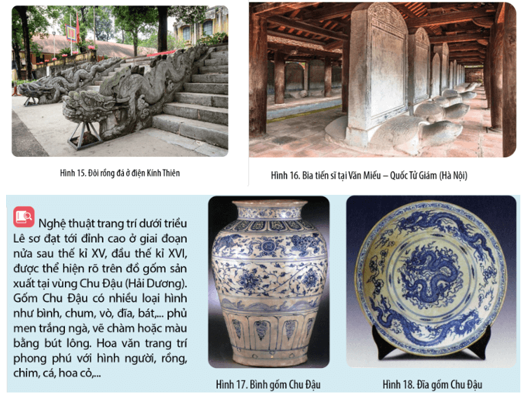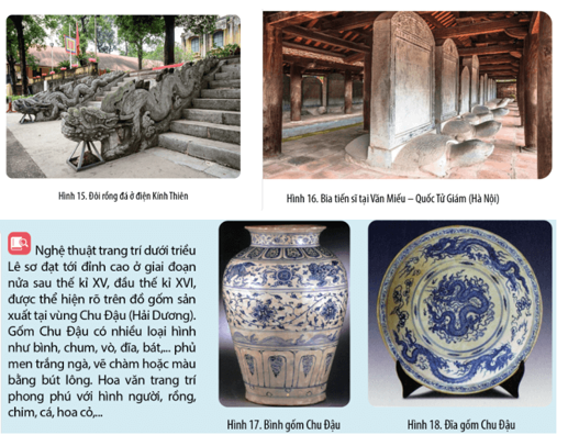 + Điêu khắc thời Lê sơ phát triển thể hiện qua hình tượng rồng, tượng quan hầu, tượng thú, bia Vĩnh Lăng, bia tiến sĩ ở Văn Miếu - Quốc Tử Giám (Hà Nội),...