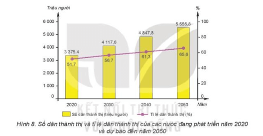 Dựa vào thông tin mục 2 và hình 8, hãy nhận xét và giải thích xu hướng đô thị hóa ở các nước đang phát triển.