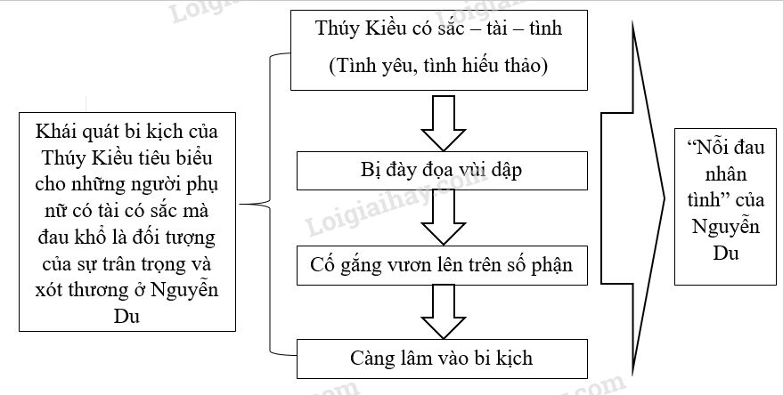 – Đời Kiều là sự hội tụ, điển hình cho những bi kịch của con người nói chung người phụ nữ nói riêng: bi kịch tình yêu, gia đình, nhân phẩm, bi kịch “tài mệnh tương đố”, “hồng nhan bạc mệnh”, bi kịch về quyền sống...