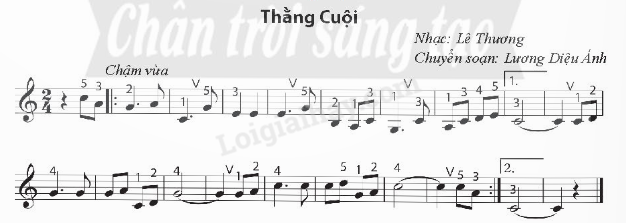 Chỉ ra các kí hiệu đã học (loại nhịp, nhịp độ, cao độ, trường độ) trong Bài thực hành số 3 - Thằng Cuội