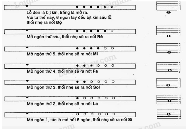 Hãy cho biết vị trí và thế bấm của các nốt đã học trên sáo recorder.