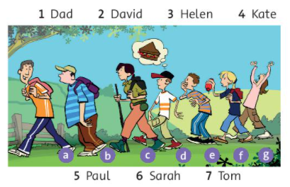 This is a nice picture of some of our family and friends on a walk. You can see my dad. He's very fit, and he loves sport. He's in sports clothes. There's my aunt, Helen. She's my dad's older sister. She's very active. And she loves walking. Near aunt Helen, there's also my dad's friend Paul. He's in sports clothes too. But he's really unfit. He's very lazy. And he never does much exercise. You can also see my sister, Sarah. It's a hot day and she's very thirsty. Then there's my brother Tom. He's always hungry. And not far from Tom. There's my brother David. He's ill in this photo. He isn't very well at all. And there's Sarah's friend Kate. She's very tired. I think Kate goes to bed late sometimes. And that's all the people in the photo.