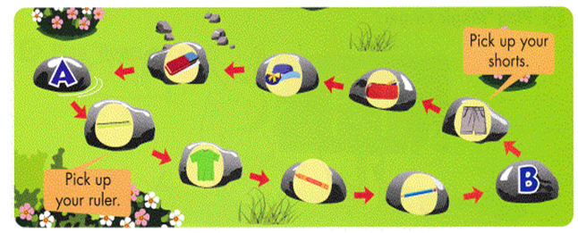 Cách chơi: Bước vòng theo các viên đá, người chơi đặt 1 câu theo mẫu “Pick up your…? Tương ứng với hình trên viên đá. Ví dụ, người chơi dừng ở viên đá có hình thước kẻ thì đặt câu “Pick up your ruler.” (Nhặt thước kẻ của bạn lên.), hay dừng ở viên đá có hình quần ngắn thì “Pick up your shorts.” (Nhặt quần ngắn của bạn lên.)