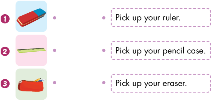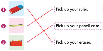 Pick up your pencil case. (Nhặt hộp bút của bạn lên nhé.)
