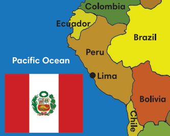 Peru thuộc Nam Mỹ. Nó có năm nước láng giềng: Ecuador và Colombia ở phía bắc, Brazil và Bolivia ở phía đông và Chile ở phía nam. Phía tây là Thái Bình Dương Ocean. Ngọn núi cao nhất Huascarán Sur, cao 6.768 mét. Peru có dân số 31 triệu người. Lá cờ của nó có màu đỏ và trắng. Thành phố thủ đô là Lima. Có ba ngôn ngữ chính thức tiếng Tây Ban Nha, Quechua và Aymara.