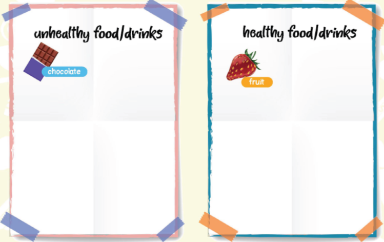 unhealthy food/ drinks (thức ăn/ đồ uống không lành mạnh) - chocolate (sô-cô-la) - candies (kẹo) - cakes (bánh) - coke (nước ngọt có ga) - coffee (cà phê) - soft drink (nước ngọt) - sugar (đường) |