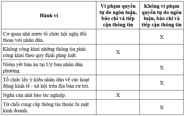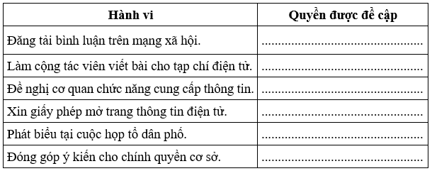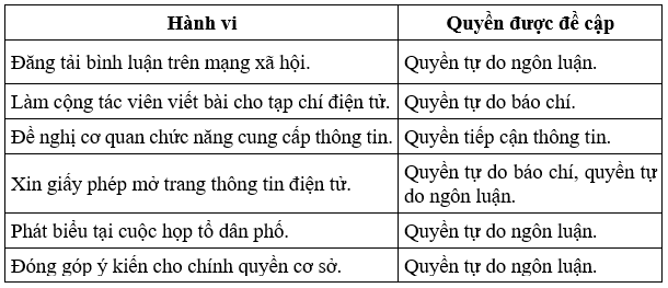 Đọc các hành vi trong bảng và cho biết hành vi thể hiện quyền tự do ngôn luận, quyền tự do báo chí và quyền tiếp cận thông tin tương ứng.