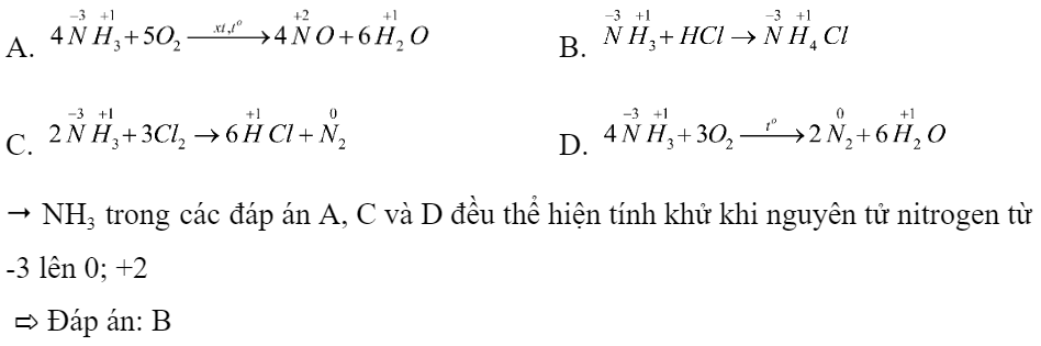 - Để NH3 thể hiện tính khử thì nguyên tử nitrogen hoặc hydrogen trong NH3 cần tăng số oxi hóa trong phản ứng