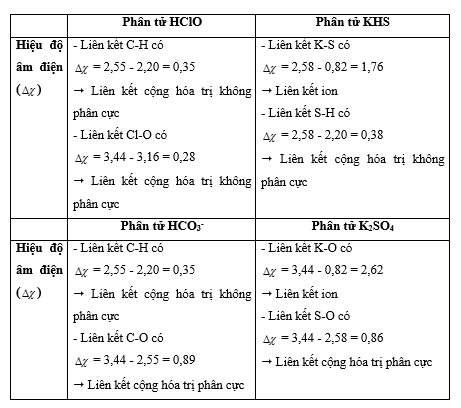 Dựa vào giá trị của độ âm điện ở Bảng 6.2 trong sách giáo khoa Hóa học 10, hãy nêu bản chất liên kết trong các phân tử và ion sau: HClO, KHS, HCO3-, K2SO4.