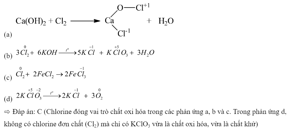 Xác định số oxi hóa của nguyên tử chlorine => Nguyên tử nào có sự giảm số oxi hóa trong phản ứng => Chlorine là chất oxi hóa
