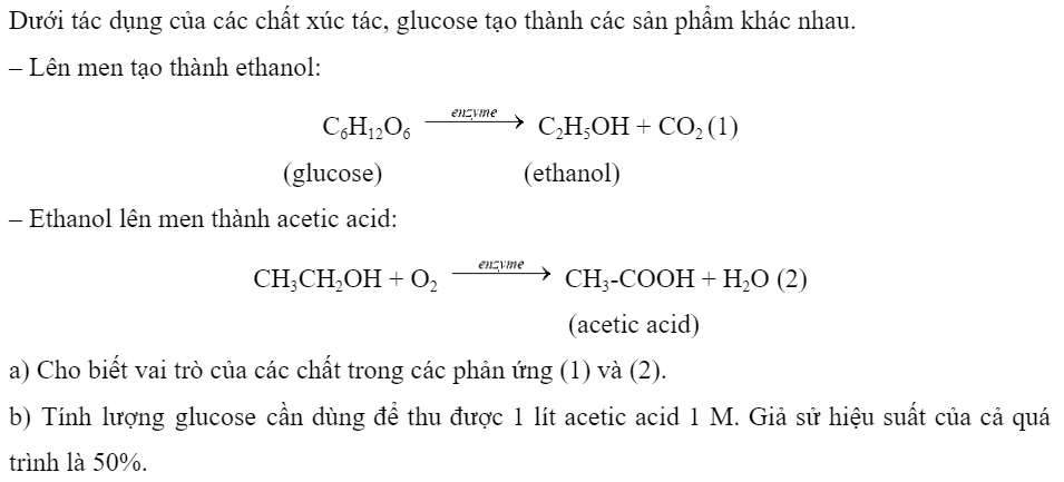 b) Tính \({n_{C{H_3}COOH}}\)-> \({n_{{C_6}{H_{12}}{O_6}}}\)-> \({m_{{C_6}{H_{12}}{O_6}}}\) theo hiệu suất