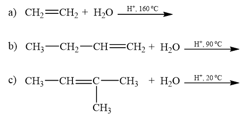 Khi tiến hành cho phân tử alkene cộng nước cần xúc tác là acid, sản phẩm thu được là alcohol. Nhiệt độ cần thiết cho phản ứng phụ thuộc vào bậc của alcohol tạo thành. Alcohol bậc III chỉ cần nhiệt độ dưới 25 °C. alcohol bậc II cần nhiệt độ dưới 100 °C và alcohol bậc I cần nhiệt độ dưới 170 °C. Viết các phương trình phản ứng sau (chỉ viết sản phẩm chính):