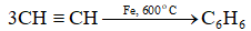 Dẫn 150 gam acetylene qua ống sắt nóng đỏ thu được 90 gam benzene. Viết phương trình phản ứng xảy ra và tính hiệu suất phản ứng.