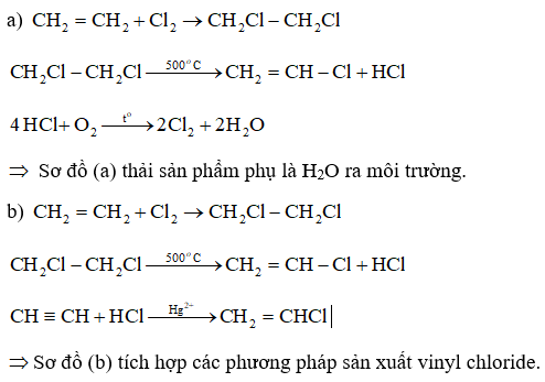 Ngày nay, các nhà máy thường sử dụng chu trình khép kín hoặc tích hợp các phương pháp để nâng cao hiệu suất, hạ giá thành sản phẩm, đồng thời giảm thiểu ô nhiễm môi trường. Viết các phương trình phản ứng biểu diễn sơ đồ sản xuất sau và cho biết sơ đồ nào là tích hợp các phương pháp sản xuất vinyl chloride? Sơ đồ nào thải sản phẩm phụ ra môi trường?