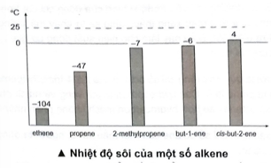Biểu đồ dưới đây thể hiện mối tương quan giữa nhiệt độ sôi và số nguyên tử carbon trong phân tử alkene.