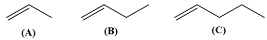 b) Đi từ propene đến pent-1-ene, kích thước phân tử alkene tăng dần làm cho diện tích bề mặt tiếp xúc giữa chúng cũng tăng, tương tác van der Waals giữa các phân tử do đó cũng tăng dần, dẫn đến nhiệt độ sôi các alkene tăng dần. Ngoài ra, ở điều kiện thường, propene và but-1-ene là các chất khí trong khi pent-1-ene là chất lỏng vì tương tác van der Waals giữa các phân tử propene và but-1-ene chưa đủ lớn. Các phân tử alkene có từ 18 nguyên tử carbon trở lên ở thể rắn, do tương tác van der Waals giữa chúng là mạnh đáng kể.