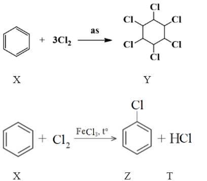 Chất lỏng (có công thức phân tử là C6H6) không màu, có mùi thơm nhẹ, không tan trong nước, là một dung môi hưu cơ thông dụng. tác dụng với chlorine khi chiếu sáng tạo nên chất rắn ; tác dụng với chlorine khi có xúc tác tạo ra chất lỏng và khí . Khí khi đi qua dung dịch silver nitrate tạo ra kết tủa trắng. Công thức của các chất lần lượt là: