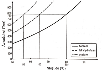 b) Căn cứ vào đồ thị đã cho, ở điều kiện áp suất 1 atm hay 760 torr, các chất acetone, tetrahydrofuran và benzene lần lượt có nhiệt độ sôi tương ứng là 56 °C, 65 °C và 80,1°C.