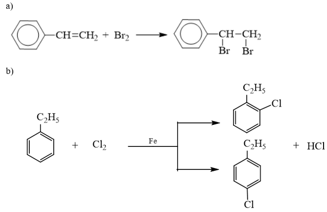 a) Phản ứng cộng bromine xảy ra ở nhóm thế -CH=CH2 của styrene.