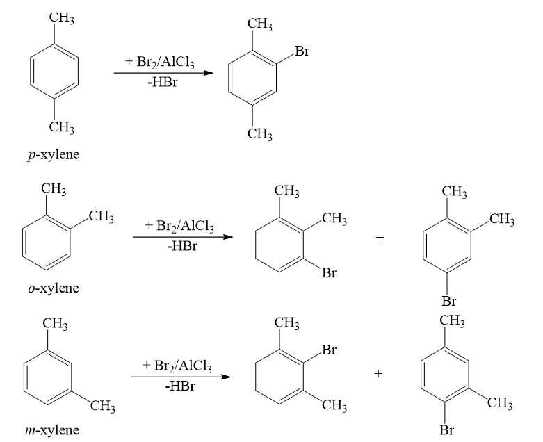 Với sự hiện diện của bột nhôm, có bao nhiêu sản phẩm monobromo dự kiến thu được do quá trình bromine hoá p-xylene, o-xylene và m-xylene. Viết các phương trình phản ứng minh hoạ.