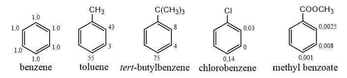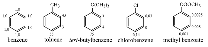 Trong phản ứng nitro hoá benzene và các hợp chất có vòng benzene, nếu quy ước tốc độ phản ứng tại một trong các carbon bất kì của benzene là 1,0 thì tỉ lệ tốc độ phản ứng tương đối của các vị trí trong vòng benzene ở một số hợp chất được cho như sau: