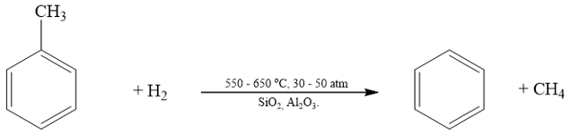 Toluene có giá trị thương mại thấp hơn nhiều so với benzene. Chính vì lí do đó nên người ta đã tiến hành loại bỏ nhóm methyl khỏi toluene bằng một quá trình gọi là dealkyl hoá. Toluene được trộn với hydrogen ở nhiệt độ từ 550 °C đến 650 °C và áp suất từ 30 atm đến 50 atm, với hỗn hợp gồm silicon dioxide (SiO2) và aluminium oxide (Al2O3) làm xúc tác.