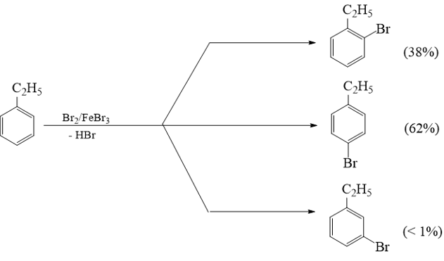 Khi vòng benzene có gắn nhóm thế alkyl, phản ứng thế nguyên tử hydrogen ở vòng benzene xảy ra dễ dàng hơn so với benzene và ưu tiên thế vào vị trí ortho hoặc para so với nhóm alkyl. Do đó m-bromoethylbenzene chỉ tạo thành ở dạng vết (<1%).