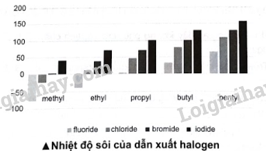 Biểu đồ dưới đây biểu diễn nhiệt độ sôi (°C) của một số loại dẫn xuất halogen. Quan sát và trả lời các câu hỏi: