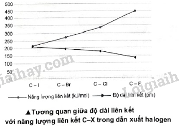 Tính chất hoá học chung của dẫn xuất halogen thể hiện qua 2 loại phản ứng thế halogen bởi nhóm hydroxy và phản ứng tách hydrogen halide. Trong đó, độ dài liên kết và năng lượng liên kết ảnh hưởng trực tiếp đến khả năng phản ứng của 2 loại phản ứng này. Quan sát biểu đồ bên dưới và trả lời câu hỏi.