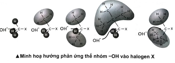 b) Quan sát hình bên dưới, cho biết yếu tố nào ảnh hưởng đến khả năng phản ứng thế nhóm –OH của các halogenoalkane trên?