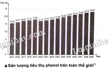 Khối lượng phenol được sản xuất từ cumene vào năm 2021: \[11,37 \times \frac{{90\% }}{{100\% }} = 10,233\](triệu tấn).
