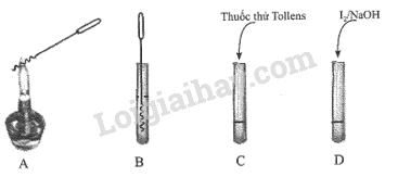 - Chia chất lỏng trong ống nghiệm B thành 2 phần, phần 1 cho phản ứng với thuốc thử Tollens và đun nóng thấy có lớp bạc sáng bám ở ống nghiệm (Hình C); phần 2 thực hiện phản ứng iodoform thấy có kết tủa màu vàng (Hình D).