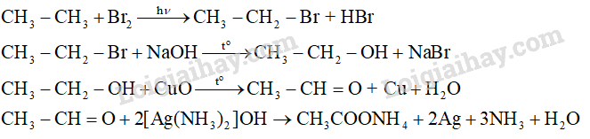 \({\rm{C}}{{\rm{H}}_{\rm{3}}} - {\rm{CH}} = {\rm{O}} + 2[{\rm{Ag(N}}{{\rm{H}}_{\rm{3}}}{{\rm{)}}_{\rm{2}}}{\rm{]OH}} \to {\rm{C}}{{\rm{H}}_{\rm{3}}}{\rm{COON}}{{\rm{H}}_4} + 2{\rm{Ag}} + 3{\rm{N}}{{\rm{H}}_{\rm{3}}} + {{\rm{H}}_2}{\rm{O}}\)