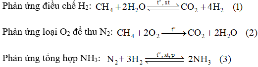 Để sản xuất khí ammonia, nếu lấy 841,7 m3 không khí (chứa 21,03% O2; 78,02% N2, còn lại là khí hiếm theo thể tích), thì cần phải lấy bao nhiêu m3 khí methane và bao nhiêu m3 hơi nước để có đủ lượng N2 và H2 theo tỉ lệ 1 : 3 về thể tích dùng cho phản ứng tổng hợp ammonia. Giả thiết các phản ứng (1), (2) đều xảy ra hoàn toàn và các thể tích khí đo ở cùng điều kiện.