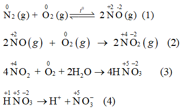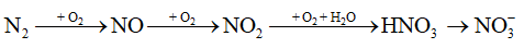 Trong những cơn mưa dông kèm sấm sét, nitrogen kết hợp trực tiếp với oxygen tạo thành sản phẩm là NO.