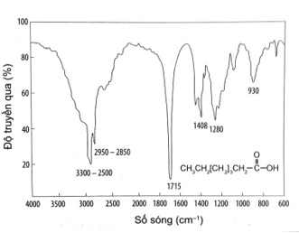 Heptanoic acid được ứng dụng trong mĩ phẩm, nước hoa và các ứng dụng tạo mùi thơm. Dựa vào phổ hồng ngoại, hãy cho biết peak nào giúp dự đoán được trong hợp chất này có nhóm chức carboxyl.