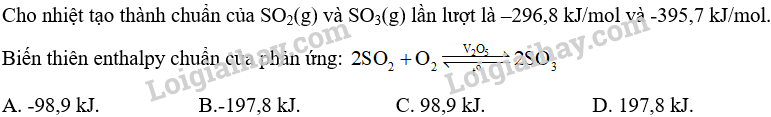 \(\begin{array}{l}{\Delta _{\rm{r}}}{\rm{H}}_{{\rm{298}}}^{\rm{0}} = 2{\Delta _{\rm{f}}}{\rm{H}}_{{\rm{298}}}^{\rm{0}}{\rm{(S}}{{\rm{O}}_3}) - 2{\Delta _{\rm{f}}}{\rm{H}}_{{\rm{298}}}^{\rm{0}}{\rm{(S}}{{\rm{O}}_2})\\{\rm{ = 2}} \times {\rm{(}} - 395,7) - 2 \times ( - 296,8)\\{\rm{ = }} - {\rm{197,8 (kJ)}}\end{array}\)
