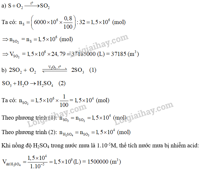 b) Giả thiết có 1% lượng khí SO2 tạo ra khuếch tán vào khí quyển rồi bị chuyển hoá thành sulfuric acid trong nước mưa theo sơ đồ: