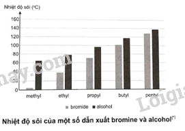 a) Theo chiều tăng gốc alkyl, từ methyl đến pentyl, nhiệt độ sôi của các dẫn xuất bromide và alcohol tăng dần. Nguyên nhân là do sự tăng tương tác Van der Waals giữa các phân tử.
