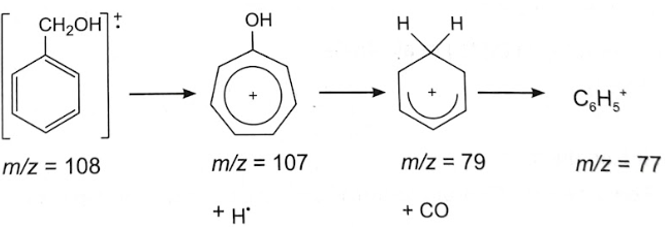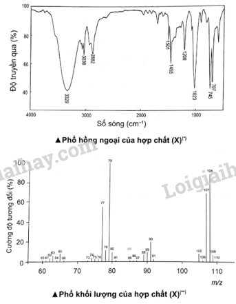 - Tín hiệu có m/z = 108 Công thức phân tử và công thức cấu tạo của (X) lần lượt là C7H8O và C6H5–CH2–OH.